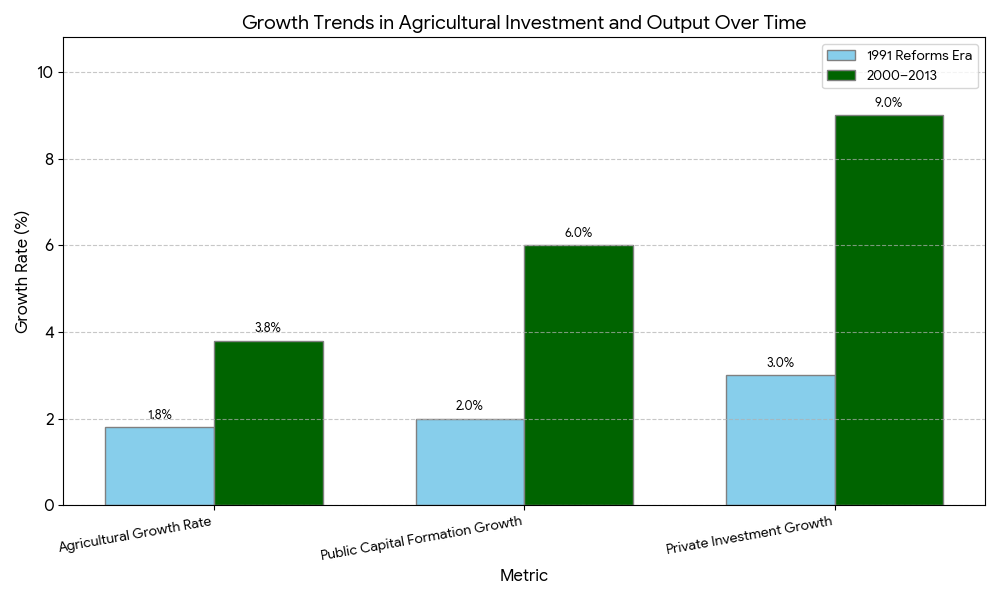 Growth Trends in Agricultural Investment and OutputThe story of India’s agricultural revival in the 2000s proves that strategic investments can transform the sector. As we move forward, the “Invest in India” movement is an opportunity to: